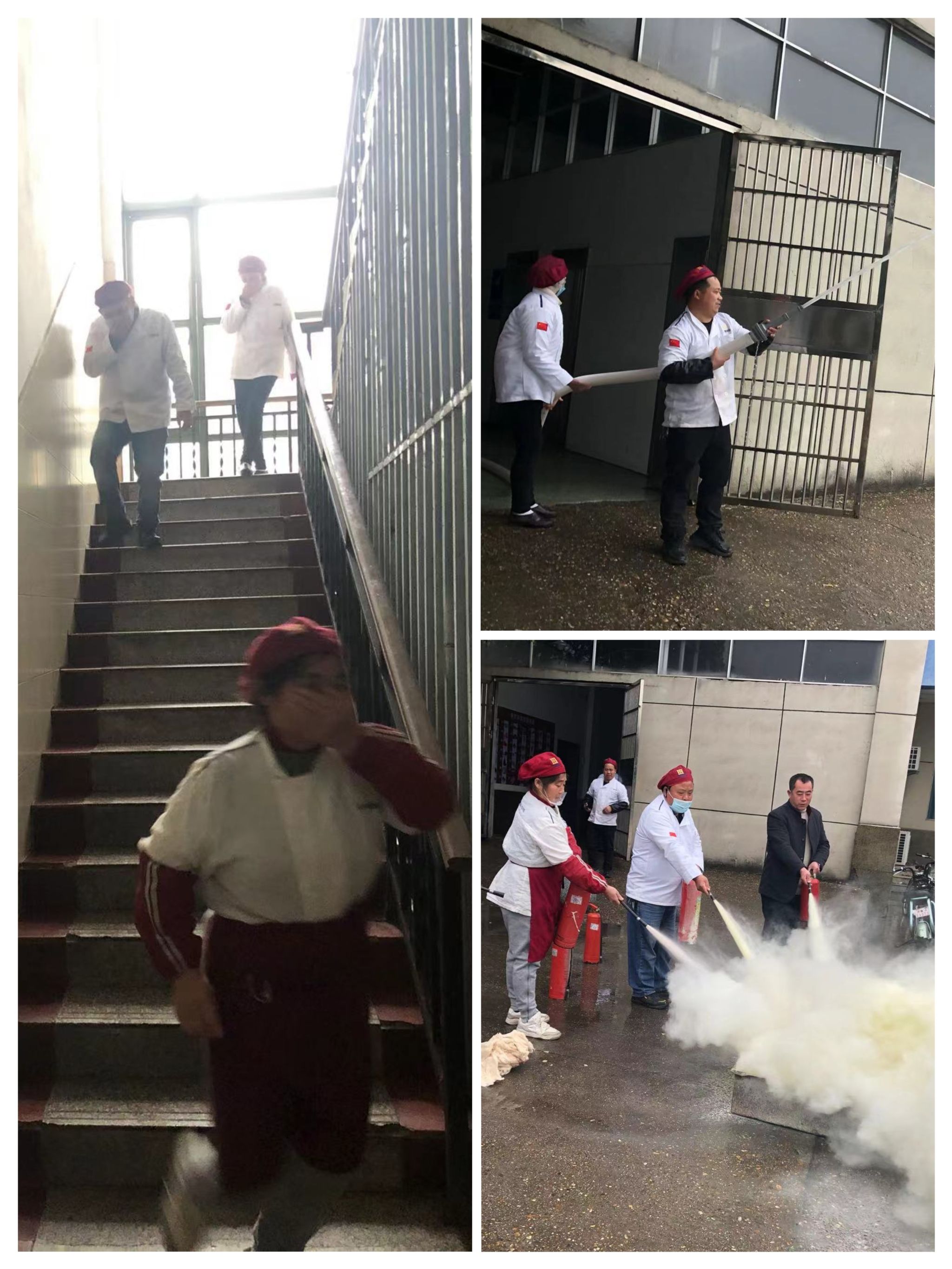 演练中,安保和食堂工作人员进行了消防火灾逃生与疏散演练,保卫(部)处工作人员现场演示了消防水带的使用方法,介绍了消防器材、消防设施的使用要领,并现场指导使用灭火器和消火栓灭火操作方法。