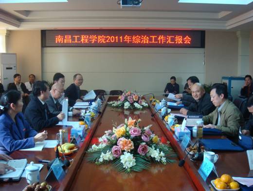 11月16日下午,以省国资委副巡视员王金林为组长的省综治考评组一行六人莅临我校检查2011年度社会治安综合治理工作。汇报会在行政楼300会议室举行。校领导李水弟、扶名福、梁钢、张晨曙、李明、汪荣有出席,各院(系)及职能部门负责人共40余人参加会议。汇报会由校长扶名福主持。
