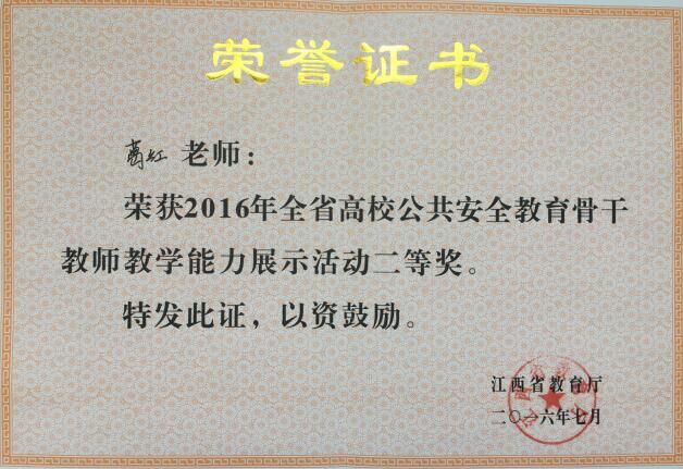 在省教育厅举办的2016年全省高校公共安全教育骨干教师教学能力展示活动中,代表我校参赛的工商管理学院青年教师葛红荣获本科组二等奖(第五名),为学校赢得了荣誉。