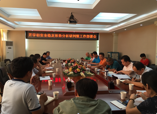 9月2日,我校在行政楼300会议室召开了开学初安全稳定形势分析研判暨工作部署会。会上传达了《关于切实做好秋季开学期间学校安全稳定工作的通知》(赣教电传字30号)、《关于开展2016年秋季开学暨年度重点工作落实情况专项督导检查的通知》(赣教督办字〔2016〕45号)等文件精神,各单位主要负责人汇报了开学初安全稳定情况,对《南昌工程学院2016年秋季开学期间安全稳定工作方案》和《2016年秋季开学期间学校安全稳定工作任务分解表》进行了部署。