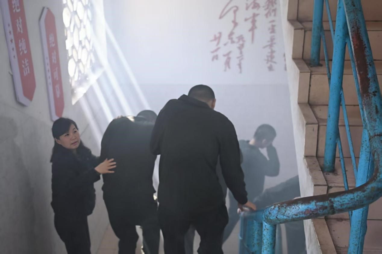 演练现场,通过烟雾弹制造逼真的火场环境,模拟宿舍楼突发火情,参演师生迅速反应,按照“掩住口鼻、低姿前行”的逃生原则,沿安全通道有序撤离至集合点。